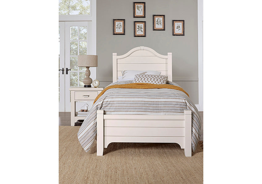 Arched headboard featuring horizontal planks and solid wood posts. Also available with a storage footboard.
