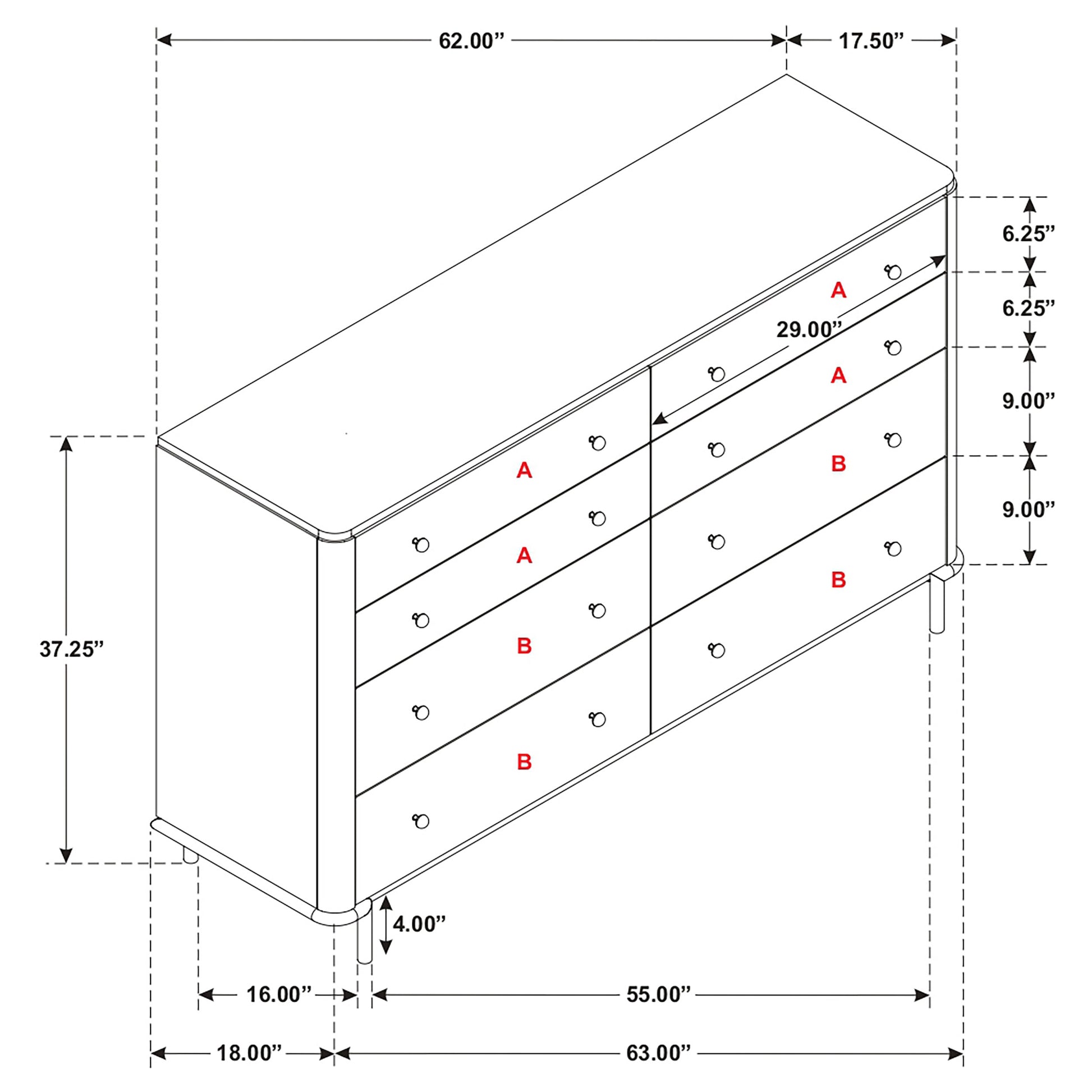 Create a modern glam vibe to your bedroom with this mid-century modern dresser. An elegant neutral tone works with numerous color palettes, presented in the sand wash finished wood. Wire-brushed finishing offers a subtle texture and organic nature to this eight-drawer dresser. Along each of the eight drawers are aged brass round knobs for a metallic touch. This spacious, long dresser also rests cradled on slender, aged brass metal legs that offer a slight elevation over floors, allowing for extra storage beneath.