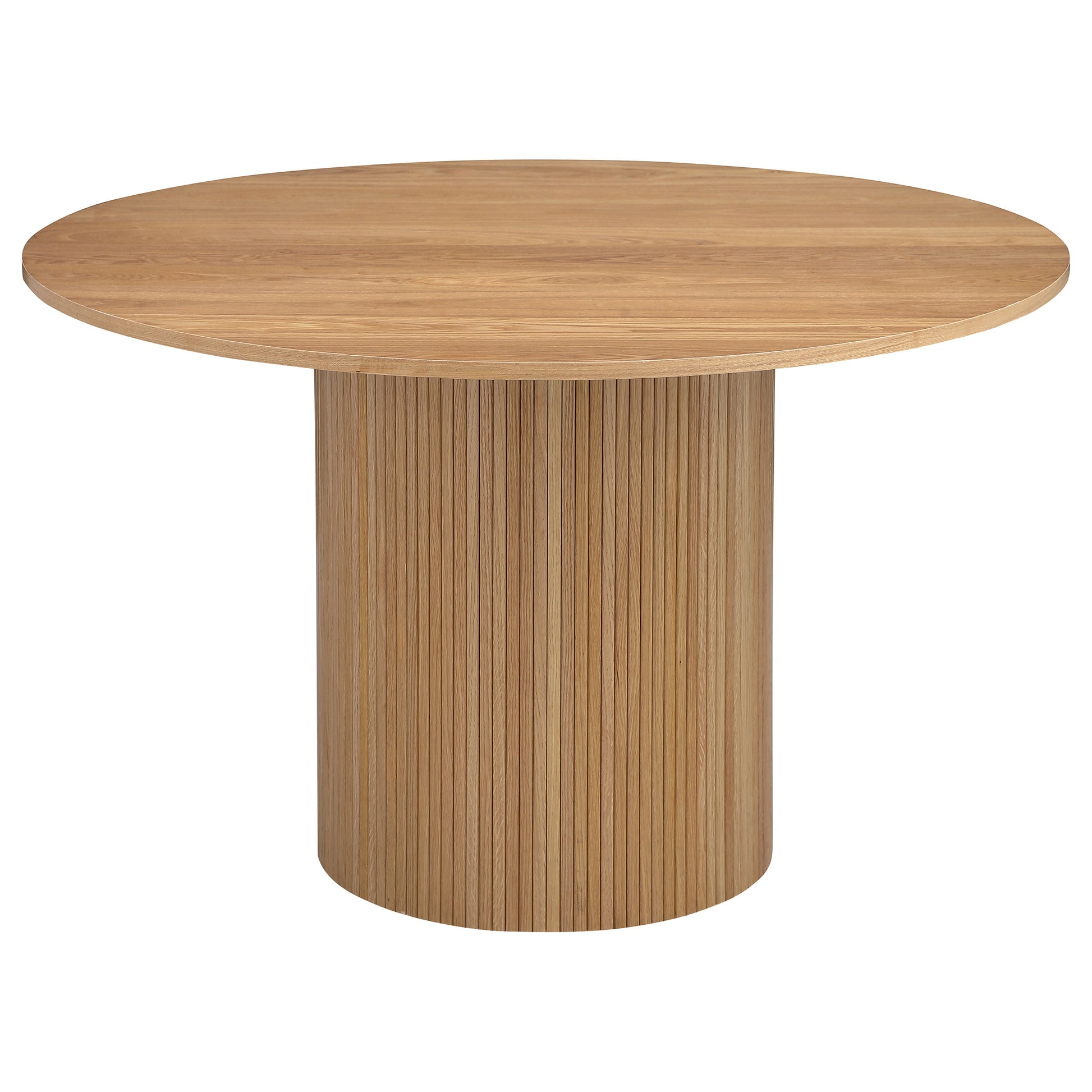 Revamp your kitchen or dining room with a stylish, light brown dining table. This modern round dining table, made from wood with an ash veneer in a natural finish, is a warm, unifying choice for a contemporary dining space. The round tabletop features a sleek and modern silhouette, offering a simple, clean look that is both comfortable and inviting. The table stands on an eye-catching fluted base, a round post pedestal with vertical ribbing that adds a decorative touch without overwhelming. The wood grain details on the tabletop offer an inviting organic flair, adding visual interest to the overall design. This table comfortably seats 4 people, making it perfect for intimate gatherings or family dinners.