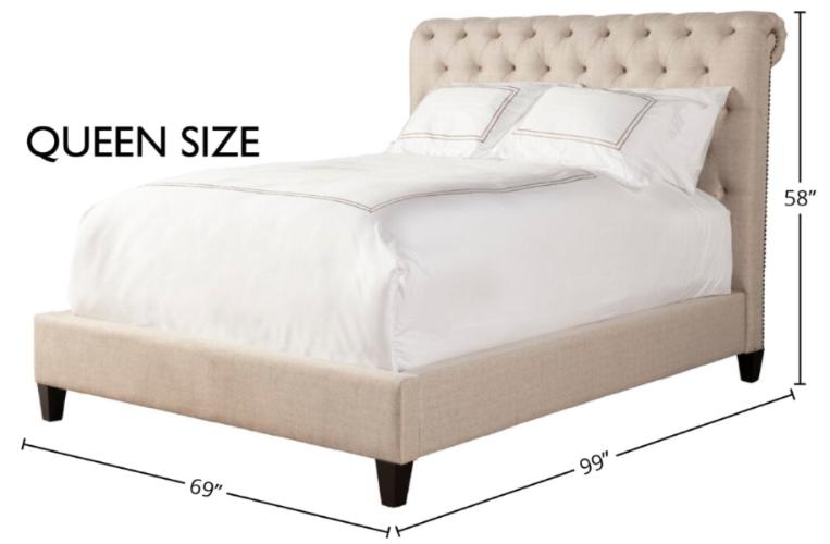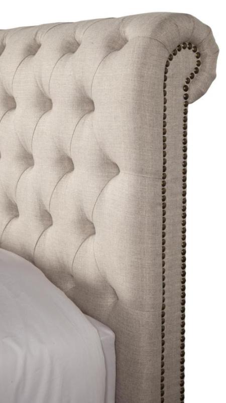 Capturing the character of classic Chesterfield design, the Cameron bed is dressed to impress. It features a roll-back design accentuated by deep button tufting and hand-applied nail head trim. Upholstered in a high-performance, linen-inspired fabric, Cameron has an upholstered footboard and siderails complemented by tapered wood feet.
