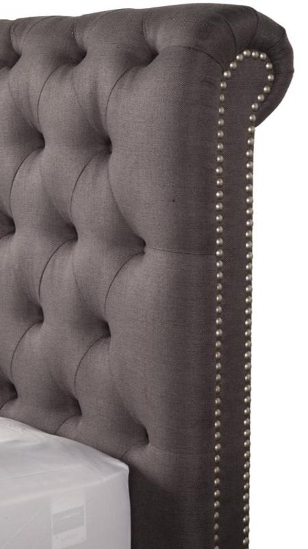Capturing the character of classic Chesterfield design, the Cameron bed is dressed to impress. It features a roll-back design accentuated by deep button tufting and hand-applied nailhead trim. Upholstered in a high-performance, linen-inspired fabric, Cameron has an upholstered footboard and siderails complemented by tapered wood feet.