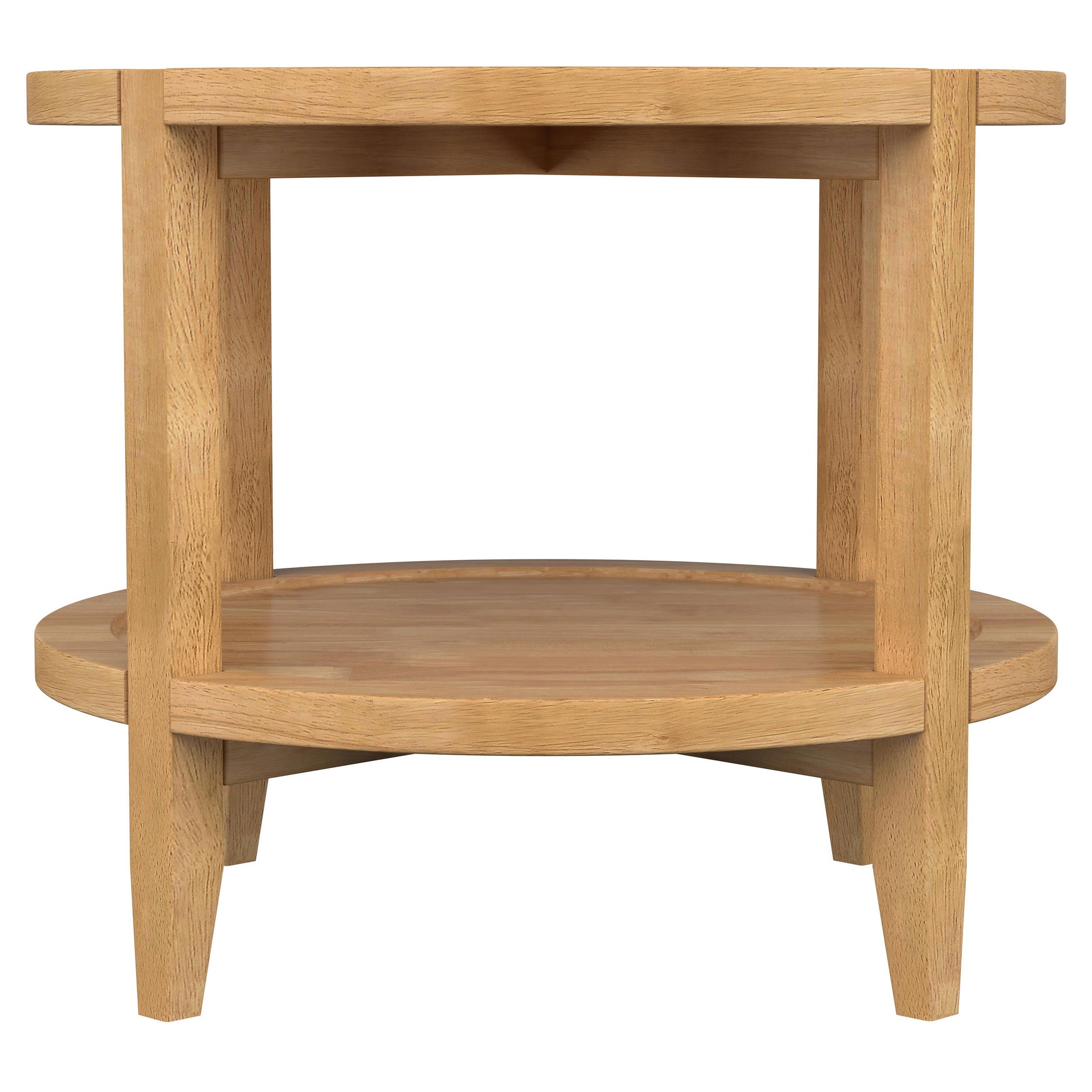 Elevate your living room with the natural warmth and cohesive charm of this coffee table set. Designed with a modern farmhouse aesthetic, the round tables feature sleek maple finishes that create a timeless and welcoming ambiance. Each table is crafted from solid rubberwood for strength and durability. The recessed tops and shelf edges introduce a tray-like effect, adding dimensionality and texture. Full lower shelves provide versatile storage or display options, enhancing both function and style.