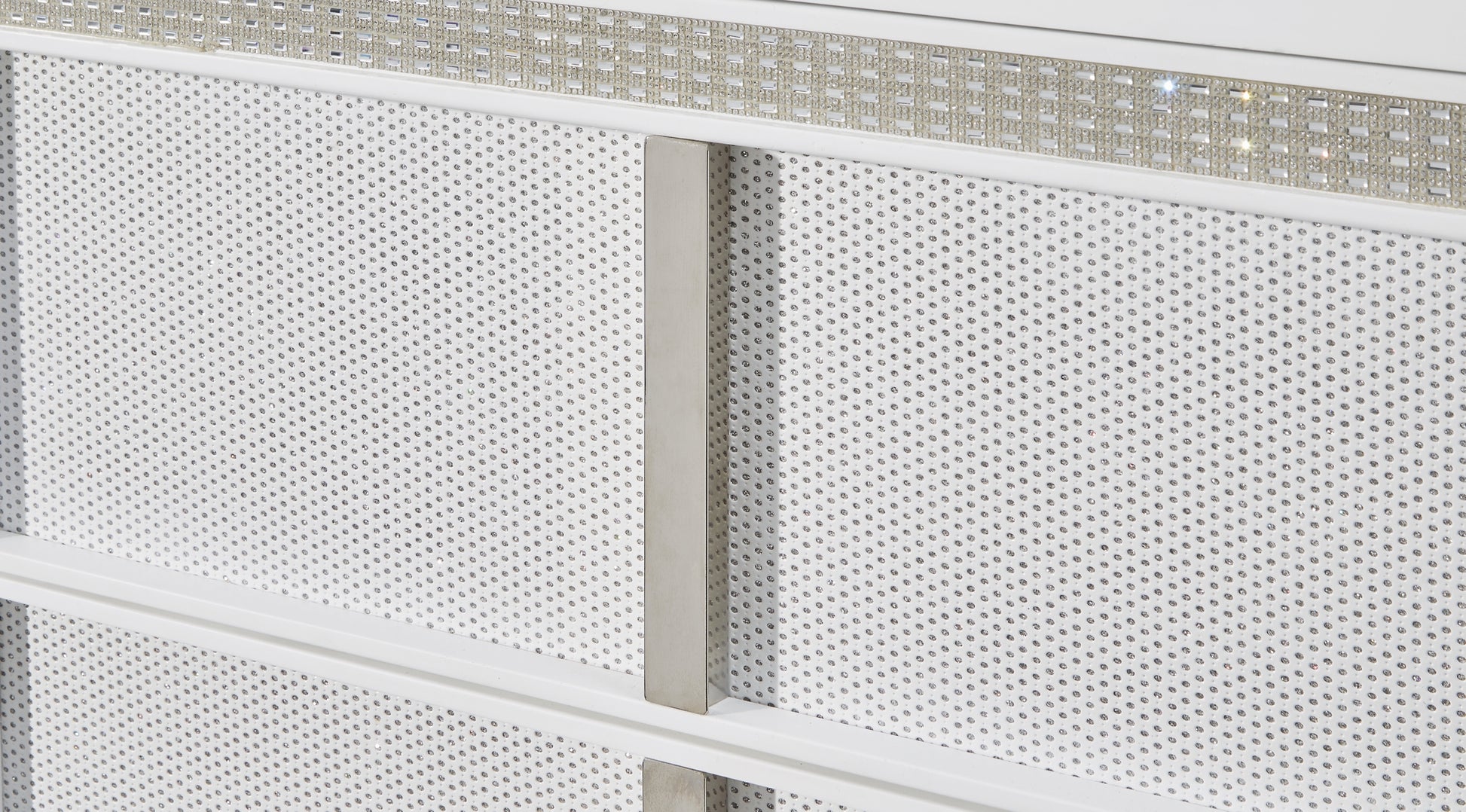 Includes queen upholstered headboard, storage footboard, rails and roll slats, Made with solid wood components, MDF substrate and decorative laminate, White lacquer finish, Vertical metal drawer pulls, Faux leather upholstery, Built-in LED lighting with 3-way dimmer switch, 2 drawers with fully finished interior, dovetail construction and ball-bearing side glides, Drawers with rhinestone frames; textured laminate drawer fronts, Power cord included; UL Listed, Bed does not require additional foundation/box spring; accommodates most zero clearance adjustable bases with the addition of a bunkie board, Mattress available, sold separately, Assembly required