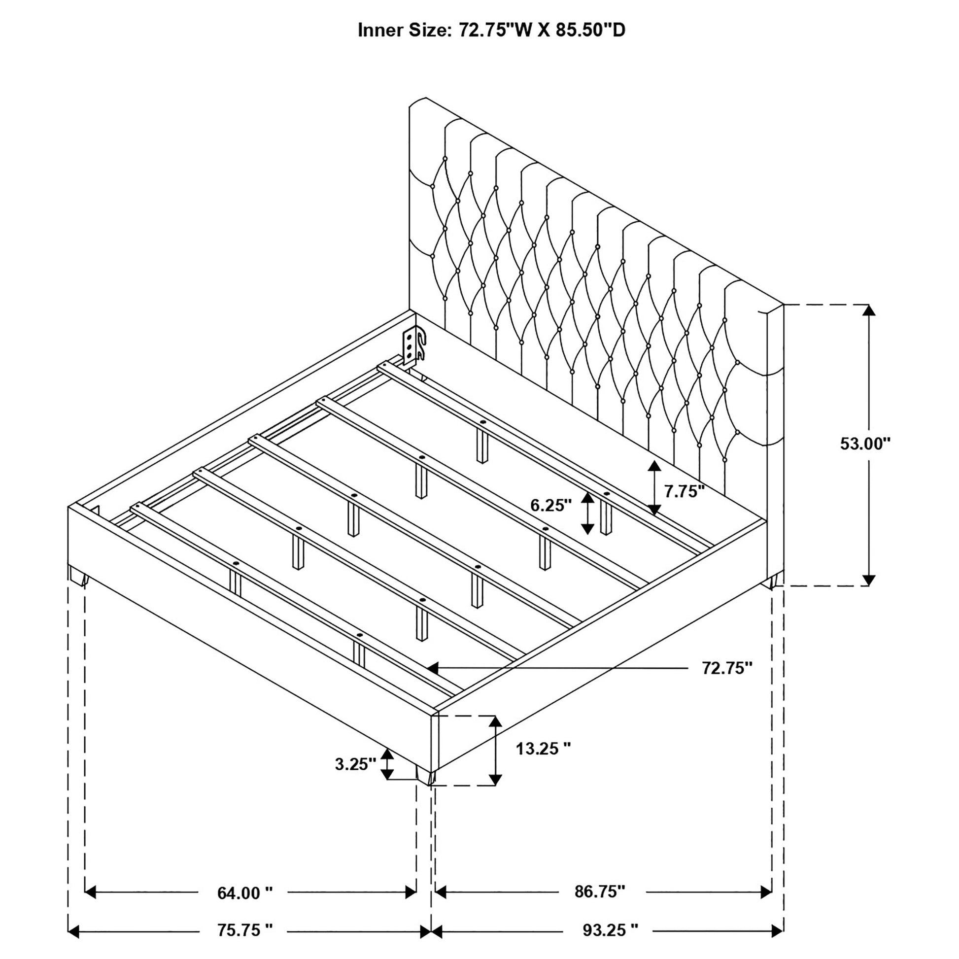 This low-slung bed combines elegant styling with a simple design that's a gorgeous addition to the home. The high headboard has crisp lines and is beautifully accented with button tufting. No footboard gives this bed an open, appealing quality. The bed sit on short espresso legs that are a handsome complement to the bed design. This bed brings an understated timeless design to the bedroom.