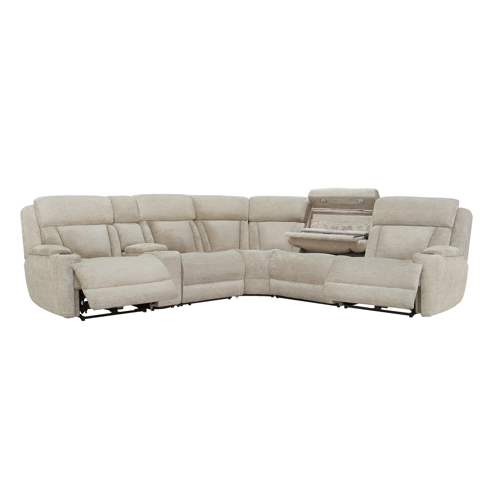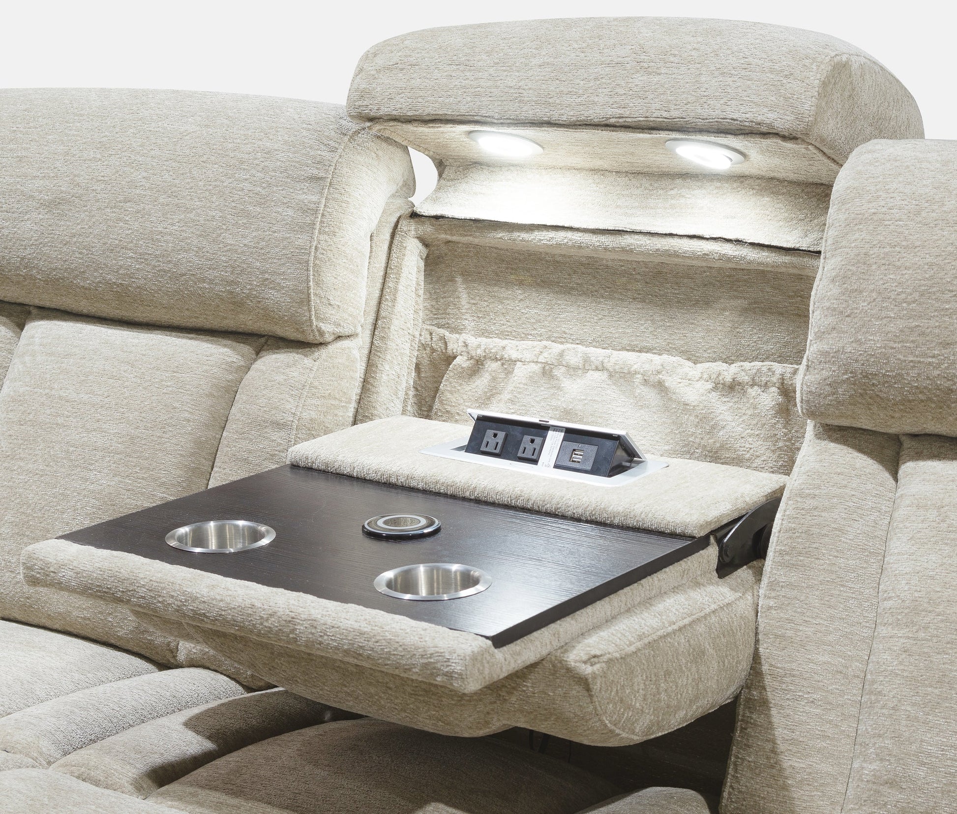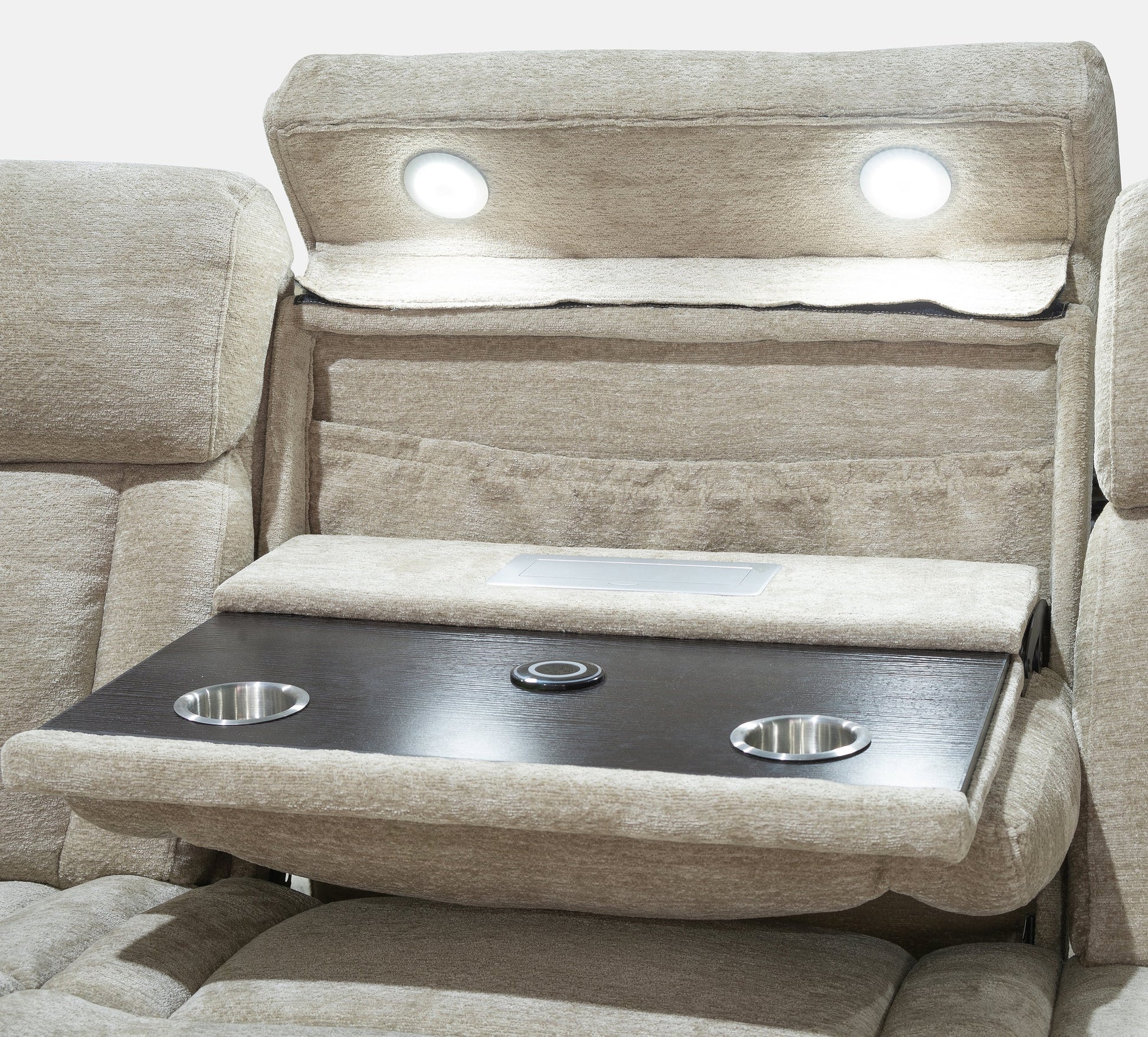 For maximum coziness, Dalton is unsurpassed. Its generously scaled design is brought to life in a plush, textural high performance chenille cover while it delivers power motion footrest and headrest functionality. Dalton's wide arms feature integrated cupholders and its overstuffed headrest and comfort channels create an exceptional comfort experience. Optional armless chair features a drop-down table with power center, cupholders and wireless charger.