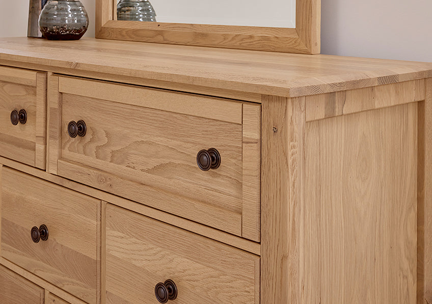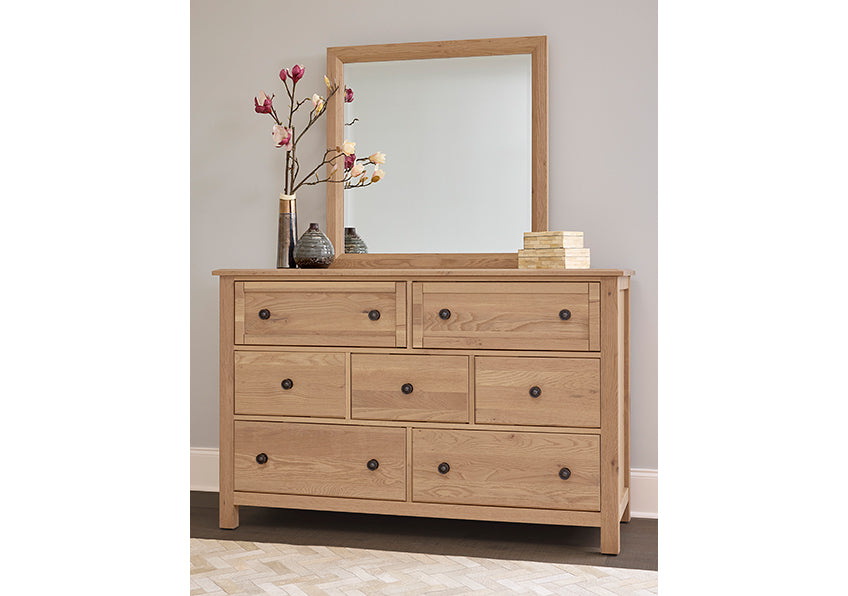 Made in the USA; this dresser shown in clear oak finish has seven drawers and is made from solid American White Oak. Its design elements create a look that fits farmhouse; loft; cottage; and coastal spaces. Available in 5 quick ship finishes.