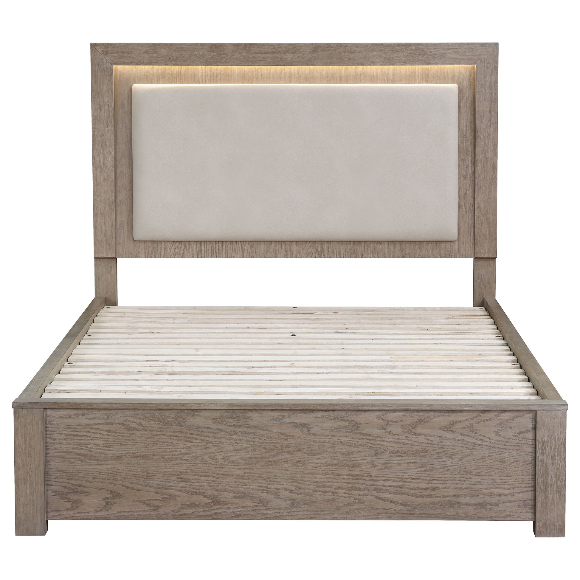 Make the most of every inch in your stylish bedroom with a modern four-drawer wooden bed that includes an upholstered headboard with LED lighting for easy ambiance. The bed boasts a barley brown finish over wood grain details, creating a soft, neutral palette with organic flair. Four drawers are tucked underneath platform slats, creating ample storage that's perfect for everything from clothing and linens to personal items. The bed is defined with a squared headboard that features an upholstered panel with foam cushioning and beige upholstery, perfect for lounging with a book or movie. Built-in LED lighting is a perfect complement, adding soft, inviting ambiance in your bedroom.