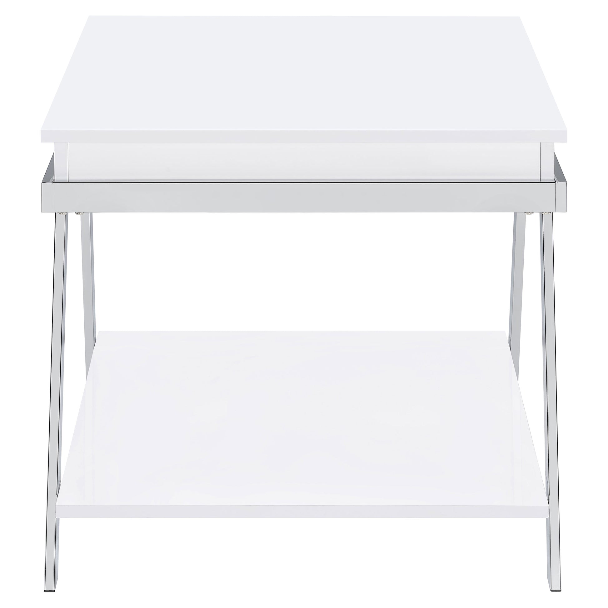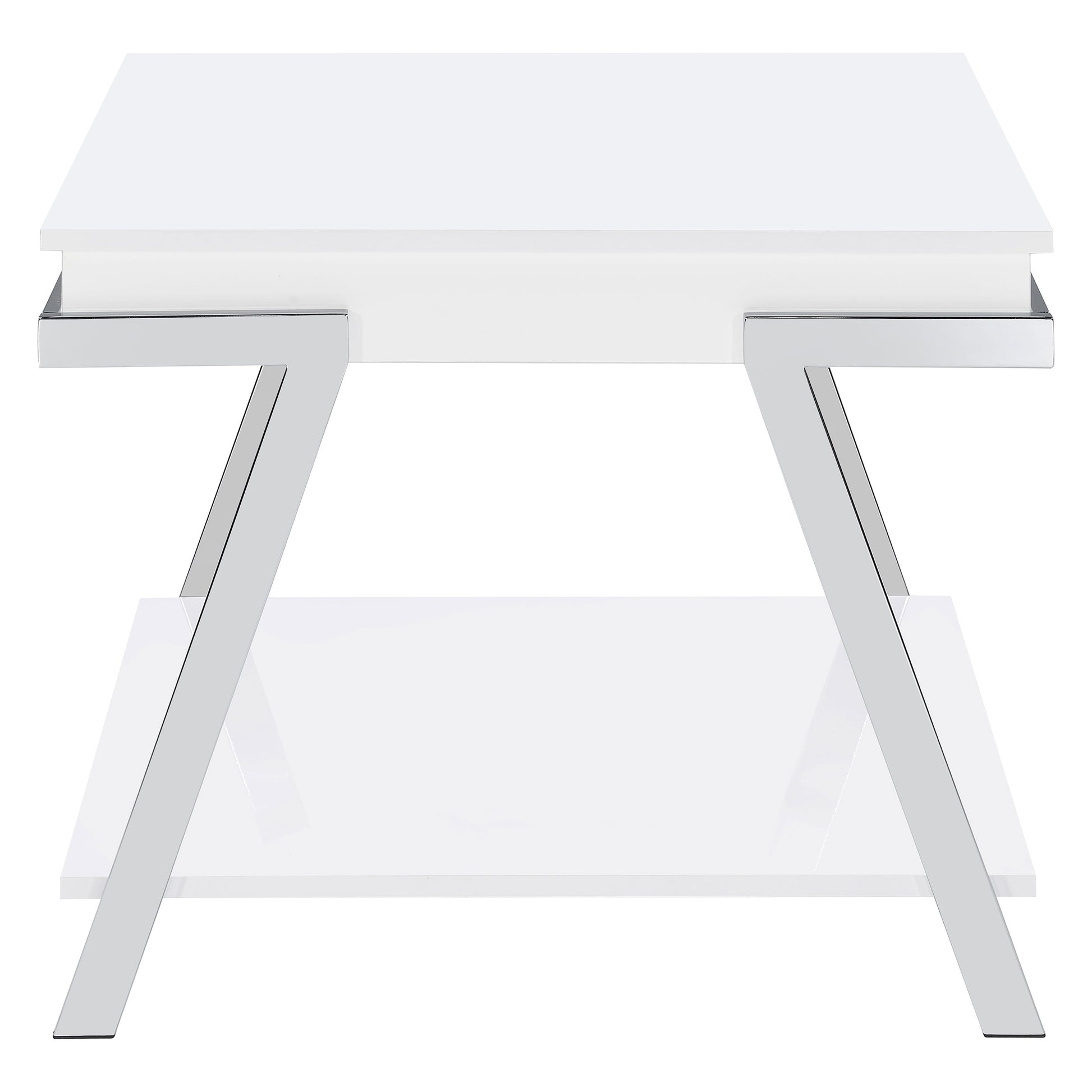 Go full-on modern with a casual feel that delivers a surprising energetic boost. This ultra-contemporary end table made of white high gloss finish MDF with paper coating creates a stir in your laid-back living room or family room. Angular metal framing adds a fresh aesthetic boost. A modular-like configuration works well in today’s trending spaces as this end table increases storage and display space with a lower shelf. Seek a seamless contemporary attitude with this stylish end table.