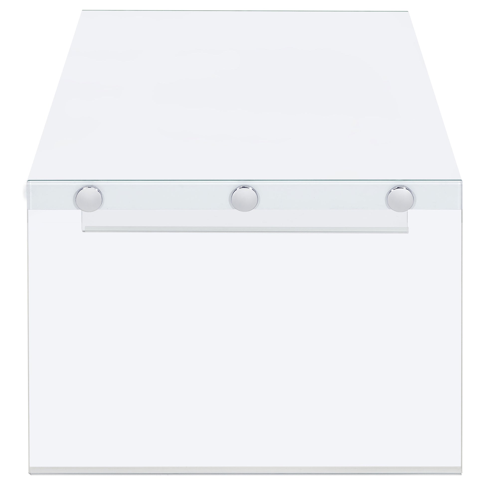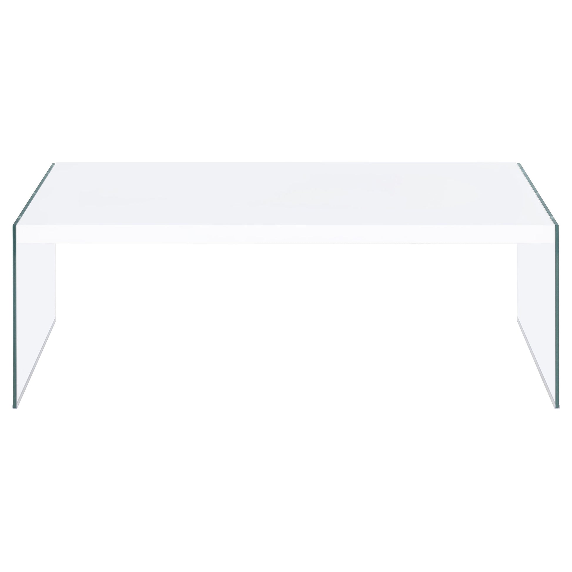 Elevate your living room with this ultra-modern rectangular coffee table, designed to blend sleek aesthetics with functionality. The engineered wood top showcases a white high-gloss finish, delivering a clean, contemporary vibe. Clear tempered glass side panels create a striking floating effect while ensuring stability. Ideal as a cocktail table, this piece is perfect for both everyday use and entertaining. Its minimalist design effortlessly complements modern interiors.