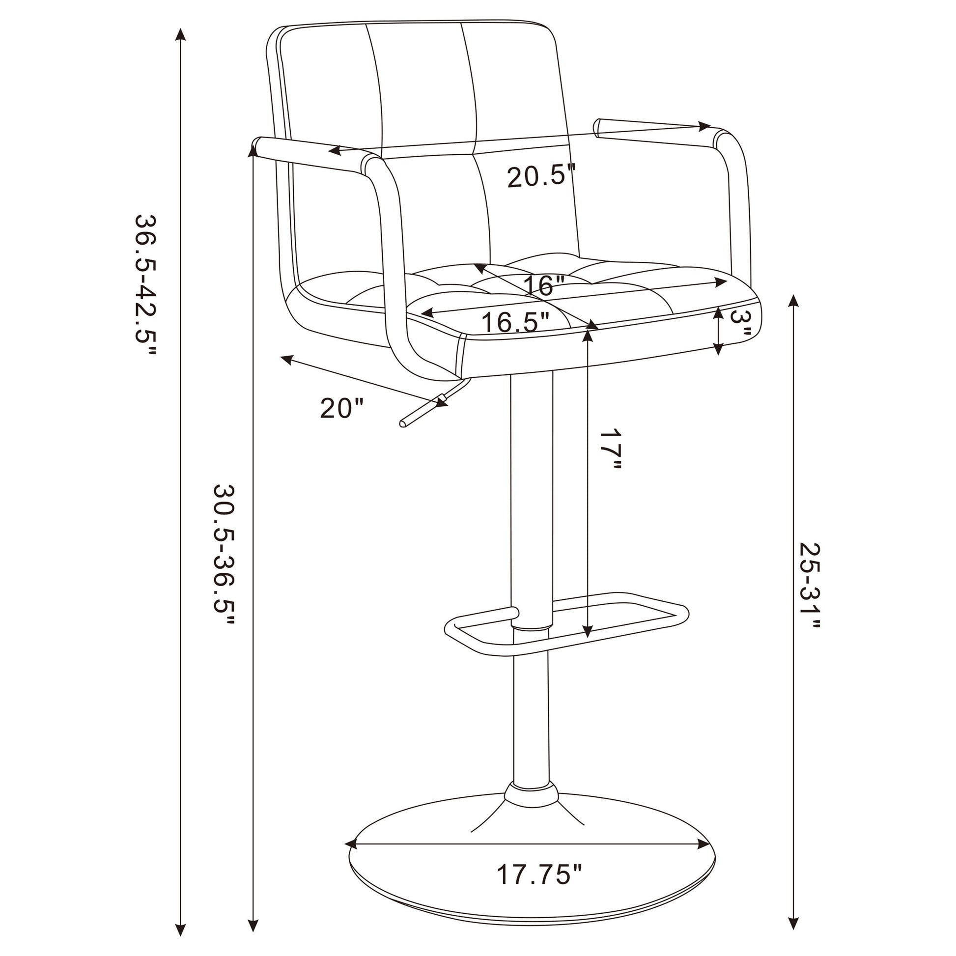 Upgrade your seating experience with this sleek hydraulic gas lift adjustable bar stool, perfect for modern kitchens or home bars. The stool features a cushioned seat with stylish tufting and a durable faux leather finish, providing both comfort and easy maintenance. Its adjustable height mechanism lets you find the perfect fit, while the chrome base and footrest add a polished, contemporary look. The integrated armrests offer added support, making it ideal for leisurely meals or casual gatherings. Enjoy both functionality and style with this versatile, high-quality bar stool.