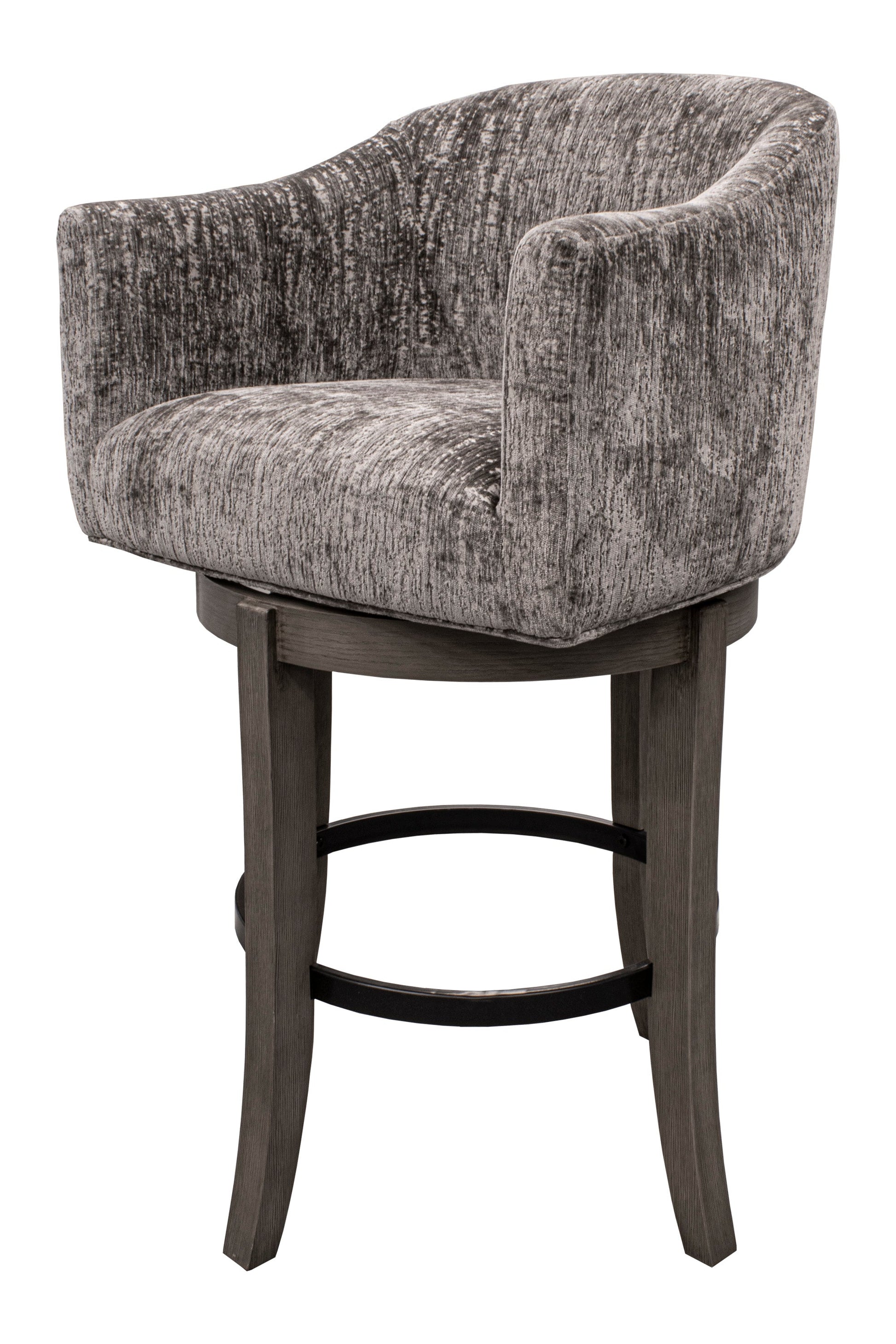 Featured-5 | Sloped arms, a rounded back and a texture chenille cover give his swivel barstool undeniable appeal. | |