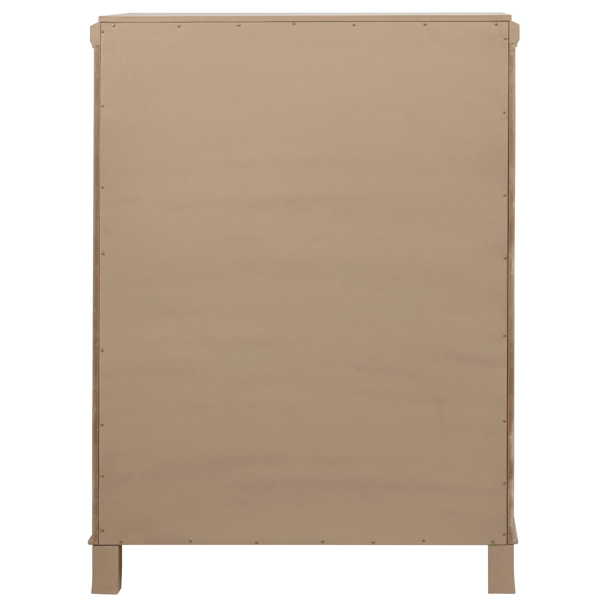 This French Provincial-inspired chest of drawers offers both timeless elegance and practical storage. Crafted from solid poplar, engineered wood, and mango veneer, it features a washed mango finish that enhances the natural wood grain. Five spacious drawers provide ample storage for clothing and essentials, while a felt-lined top drawer offers protection for delicate garments. Sleek metal handles add a refined touch, and smooth drawer glides ensure effortless operation, making this chest a perfect blend of beauty and functionality.