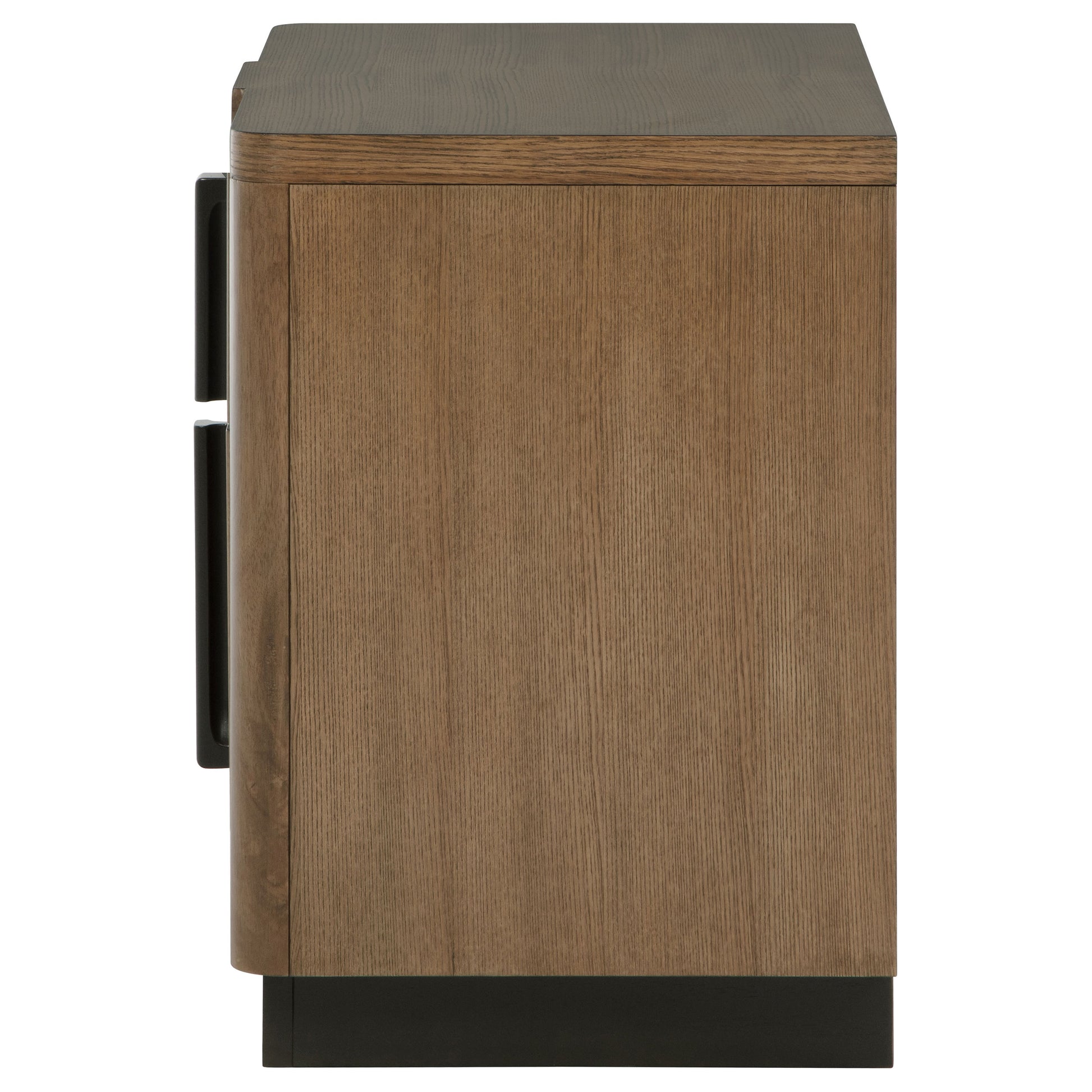 Introduce a decorative touch and plenty of convenience with a modern two-drawer nightstand. Crafted in wood, it receives a cool ash brown wood grain finish with distinctive dark drawer pulls and a matching recessed base. The drawers offer ample storage at your bedside, while the nightstand's top creates the perfect spot for a reading lamp and a choice of great books or decor. The drawer fronts feature vertical fluting that's echoed in its bar pulls, creating a sense of movement and depth. The case is complete with rounded front corners for a seamless presentation at your bedside.