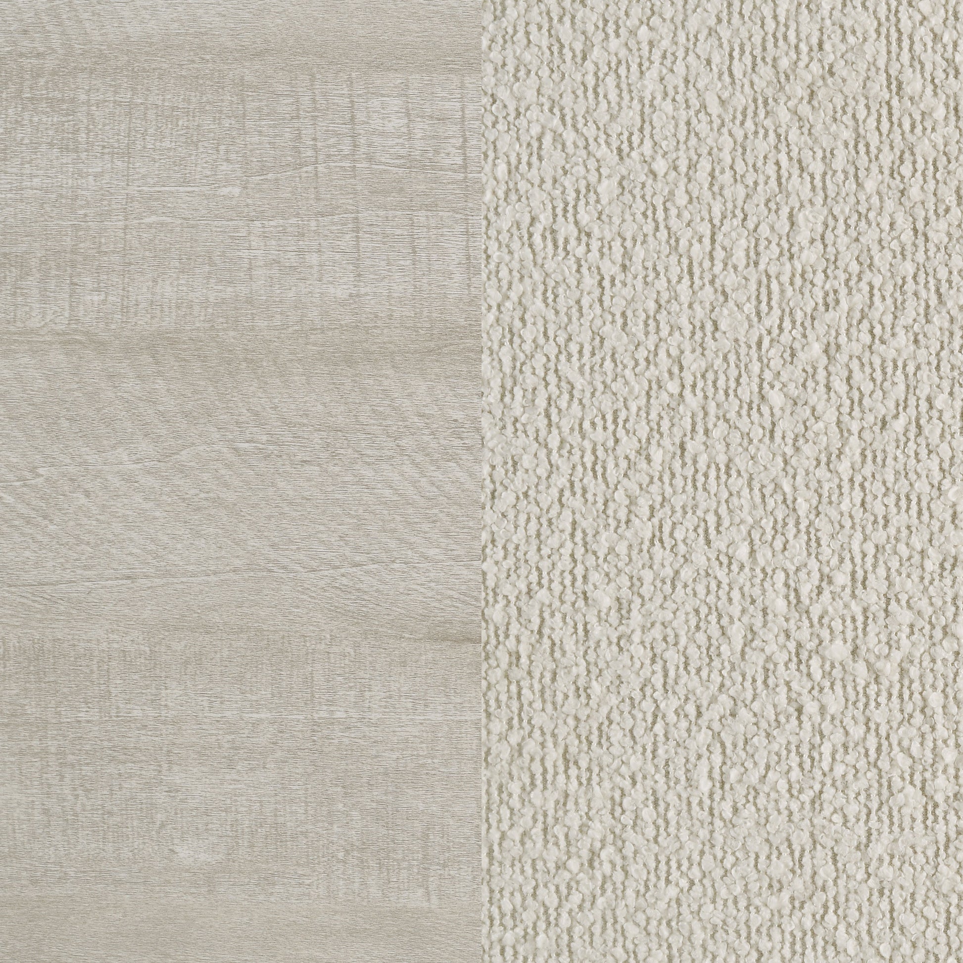 This contemporary bedroom set blends cool, modern style with rustic charm. Its Yin & Yang design pairs a rustic cream finish over engineered paper veneer with a sleek, floating bed. The headboard's padded, cream bouclé fabric adds softness, while polished nickel hardware brings shine. Crafted from rubberwood and engineered wood, drawers feature English dovetail joinery and Center metal glide for durability. This set is chic, stylish, and full of unique details.